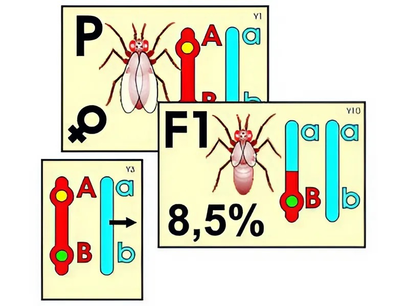 Пособие включает 10 ламинированных карточек с магнитными креплениями, из которых на магнитной доске или экране для динамических пособий монтируется схема перекреста хромосом. Для удобства использования в верхнем правом углу карточки нанесена маркировка (Y1, Y2… Y10).