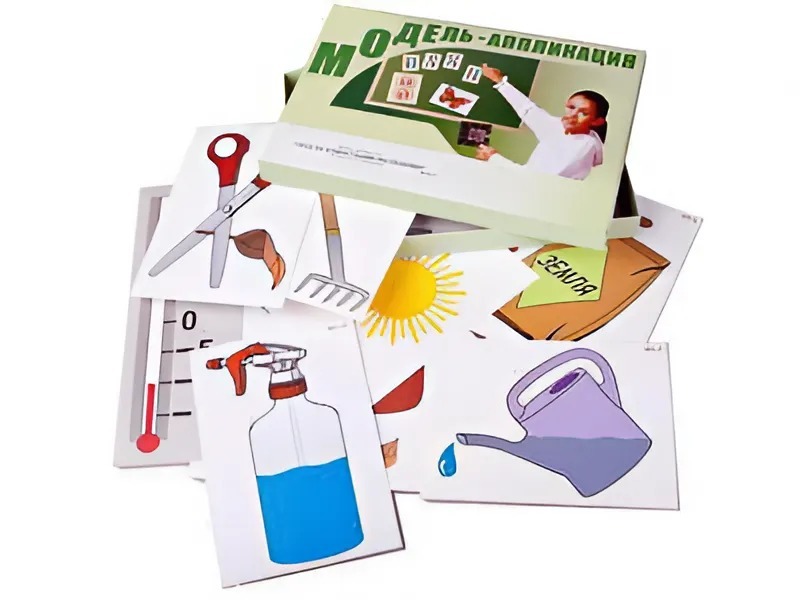 Пособие включает карточки с изображениями комнатных растений (здорового и погибшего), предметов, необходимых для ухода за ними, надписями, указывающими периодичность действий. Карточки напечатаны на картоне, ламинированы матовой (антибликовой) пленкой и снабжены магнитами, что позволяет легко крепить их на магнитной доске или экране для динамических пособий.