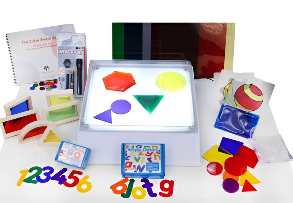 В «Светящийся набор» входит комплект уникальных материалов, которые могут использоваться в процессе обучения навыкам распознавания букв, цифр, форм и цветов. Освещенная белая поверхность «Лайтбокса» обеспечивает высококонтрастный фон и источник освещения для предметов, входящих в состав набора. Данное свойство набора обеспечивает возможность обучения основным визуальным навыкам детей с нарушенным зрением.