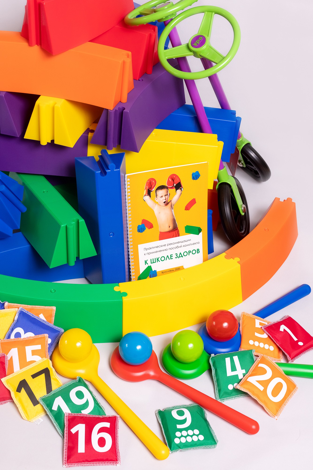 С помощью комплекта Вы сможете реализовать широкий спектр задач по физическому развитию детей. Уникальность пособий, в его составе, позволяет интегрировать в активность познавательное, социально – коммуникативное и математическое развитие.